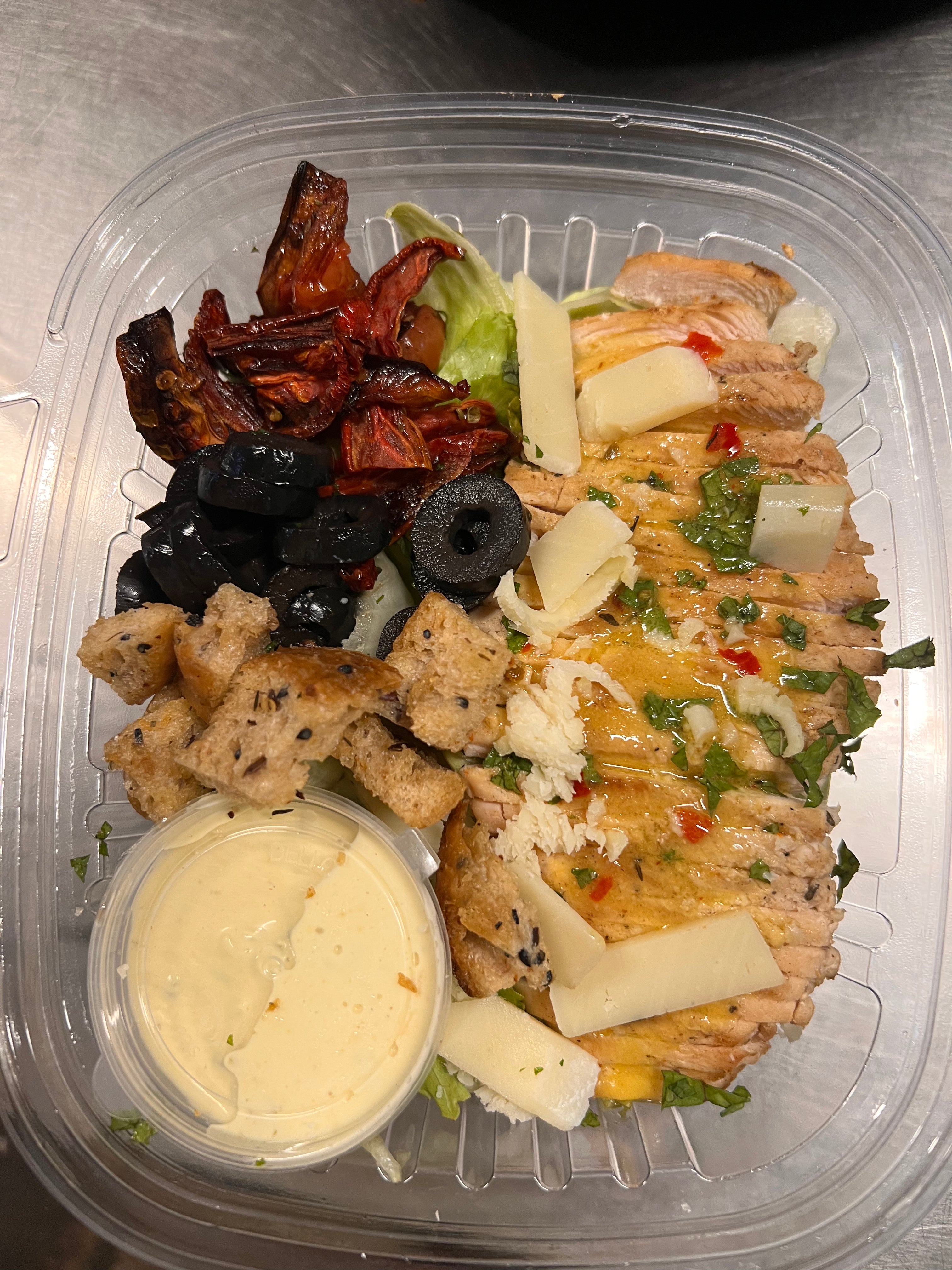 Wholewheat herbed crotons, grilled chicken, sundried tomatoes, black olive
